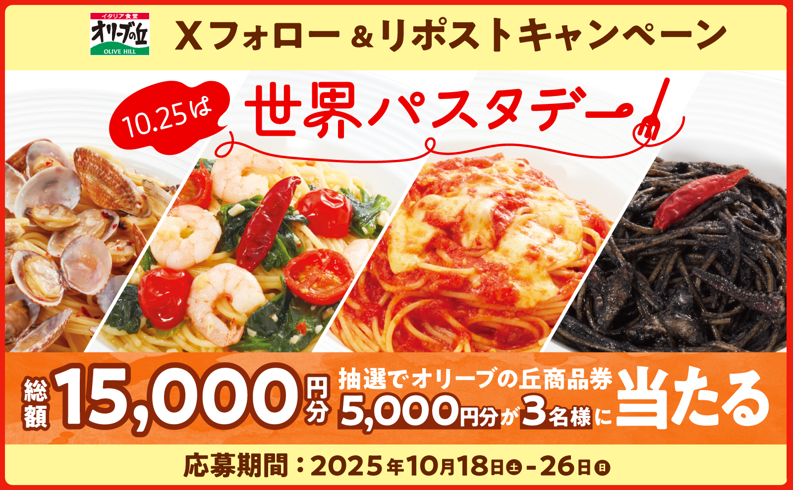 【オリーブの丘 X公式アカウント オリーブの丘で世界パスタデー フォロー&リポストキャンペーン】