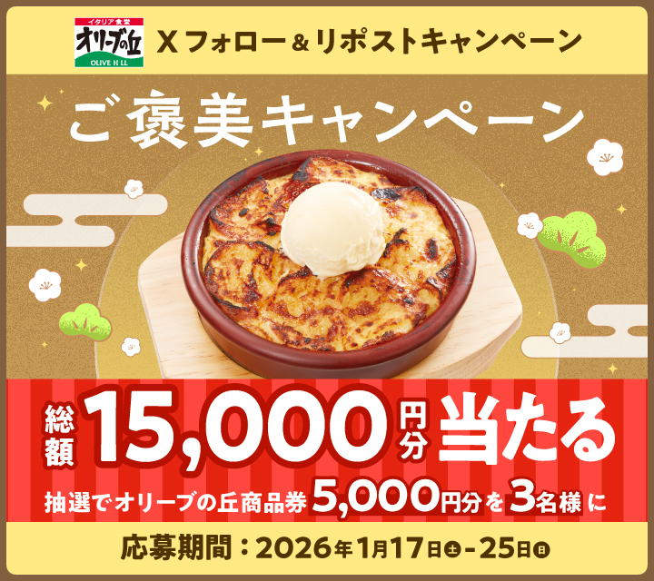 オリーブの丘 X公式アカウントをフォロー後、キャンペーン応募期間中に対象ポストをリポストしていただいた方の中から抽選で3名様にオリーブの丘で使えるお食事券5,000円分が当たるキャンペーンです。
